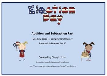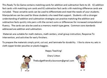 This Ready To Go Game contains matching cards for addition and subtraction facts to 10. 62 addition fact cards with matching sum cards and 62 subtraction fact cards with matching difference cards are included. These versatile cards can be used to differentiate and meet the needs of your students. Manipulatives can be used for those students who need that support. Students with a stronger understanding of addition and subtraction strategies can practice matching the addition and subtraction facts quickly into pairs with the correct sums or differences for increased computational fluency. The cards can also be used as a memory match type game. Common core standards addressed are addition and subtraction.