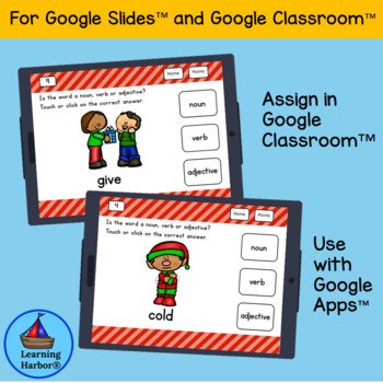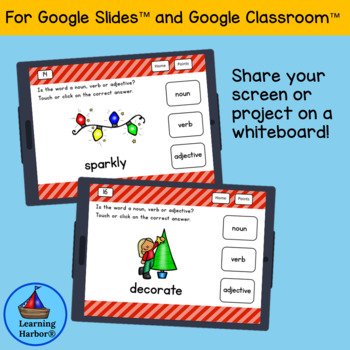 This interactive Christmas grammar activity is designed to make identifying parts of speech engaging, effective, and fun for young learners. Each slide features a delightful Christmas-themed image like reindeer, ornaments, stockings, elves, or candy canes paired with a word. Students decide whether the word represents a noun, verb, or adjective and select their answer.