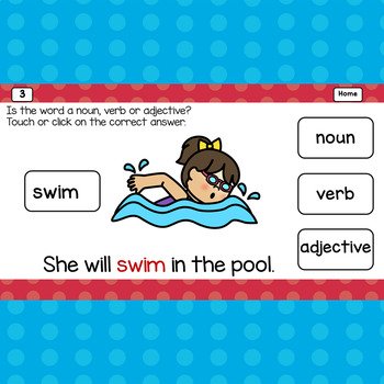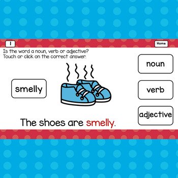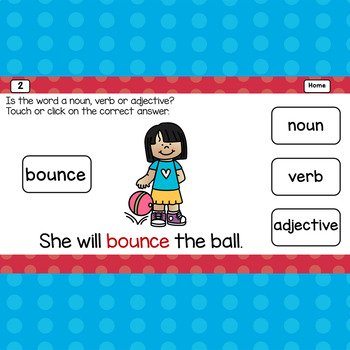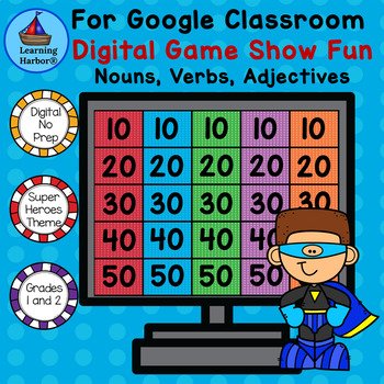 This digital game show activity will have students actively choose the noun, verb or adjective. Easy to follow written and picture directions make this game teacher, parent, and student friendly. It is engaging for whole group instruction in distance learning or the regular classroom setting. It can also be used in small groups or by individual students. The students get immediate, supportive, reinforcement from this self-correcting activity. This resource is appropriate for first grade and second grade students. It can be used with any device that runs Google Slides and it works with Google Classroom.