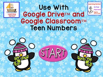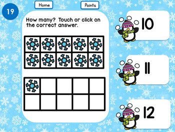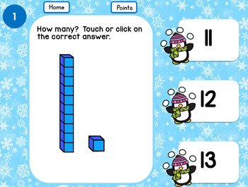 When student open the activity, they will see a home page featuring penguin-themed symbols. The student simply clicks a penguin symbol and is taken to a teen number represented with either tens block or a ten frame. The studen then chooses the correct numbereal by clicking or tapping the answer, just as they have practiced in centers and small group settings.
