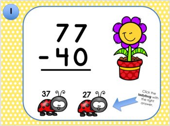This interactive PowerPoint game provides repeated, meaningful practice in a format that keeps students motivated. The activity begins on a homepage where students click an object to move to a random subtraction problem. Each slide presents a two-digit number and asks students to subtract a multiple of ten. Students select their answer and immediately receive feedback.